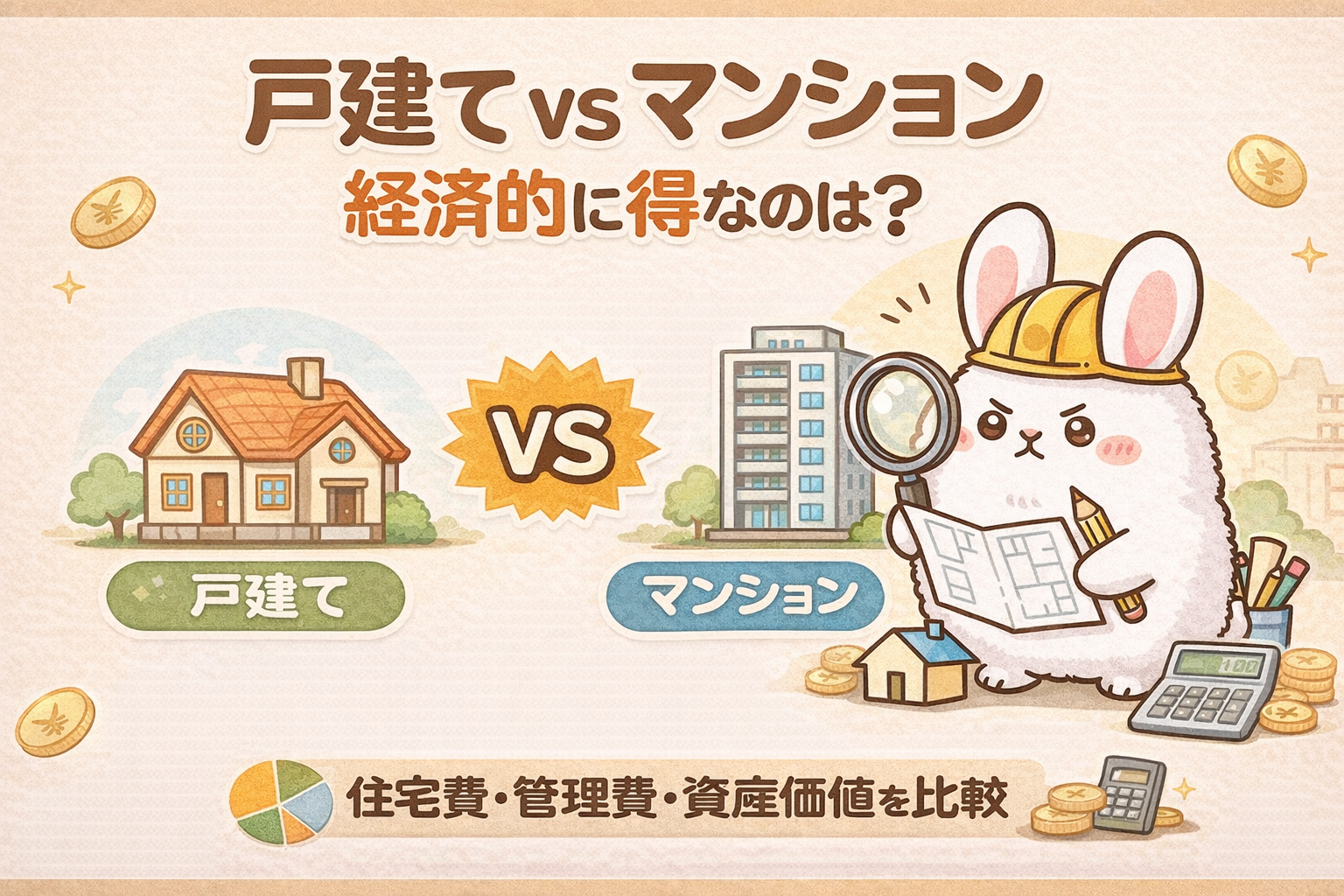 マンションの利便性や資産価値という強力なカードを前に、あえて戸建てを選んだのには、ガチで調べたからこそ分かった『確かな裏付け』がありました。ガチうさぎ家が悩みながら整理した、マンションと戸建てのメリットデメリットについて全3回に分けてご紹介していきます。第一回はお金にまつわる、経済性、資産性の整理経緯についてご紹介します!